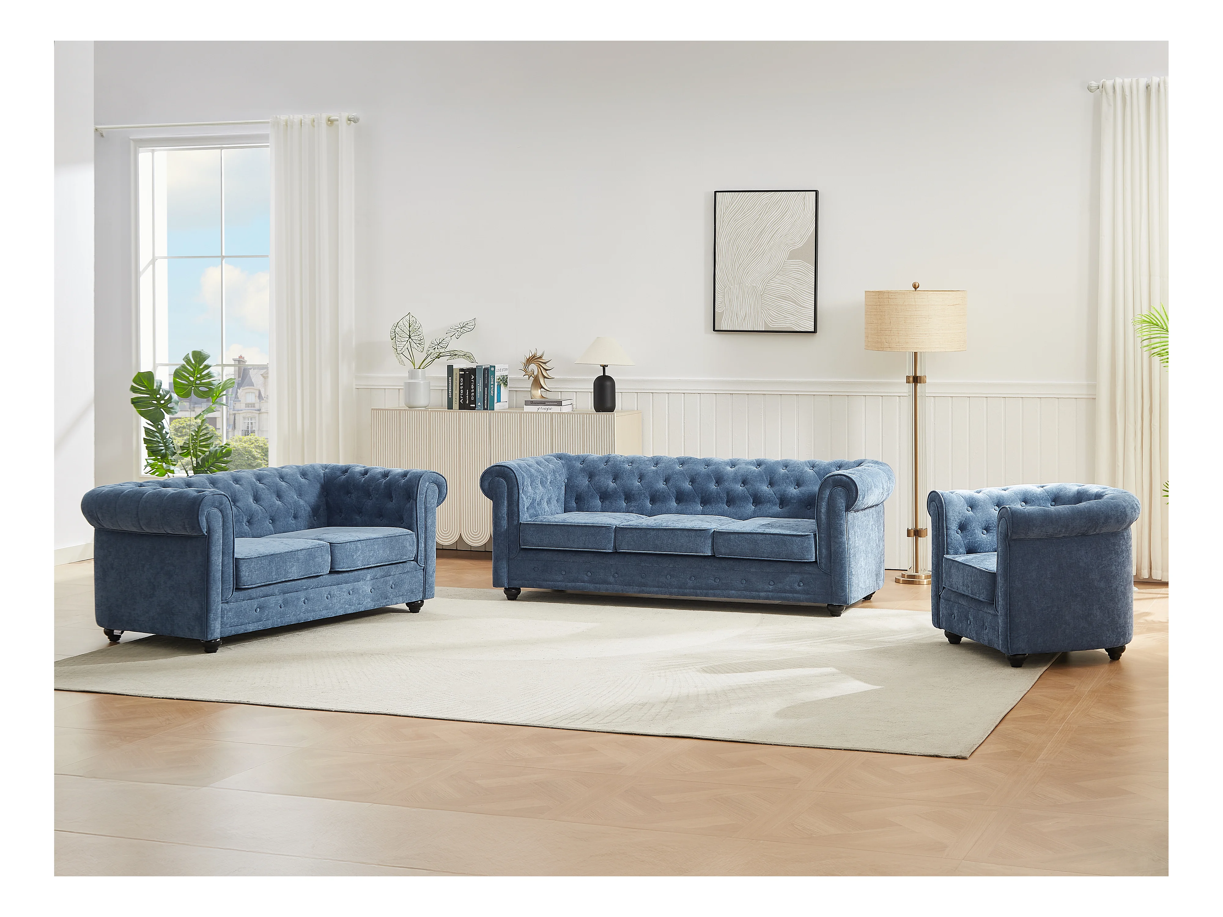 3-seters sofa, 2-seters sofa og lenestol i blått stoff CHESTERFIELD