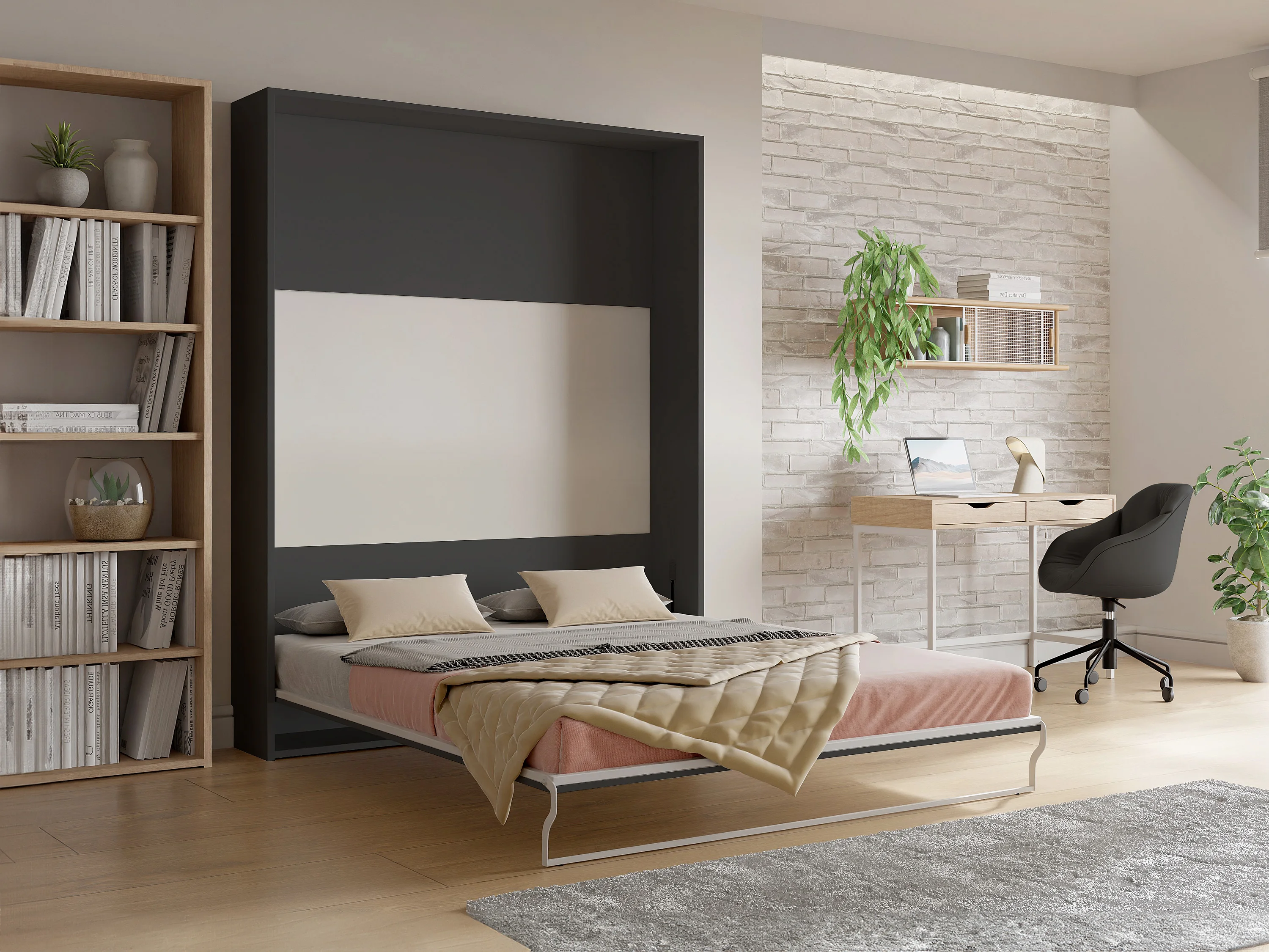 Uttrekkbar seng 160 x 200 cm - Manuell vertikal åpningsmekanisme - Antrasitt og naturfarget - MALINA II