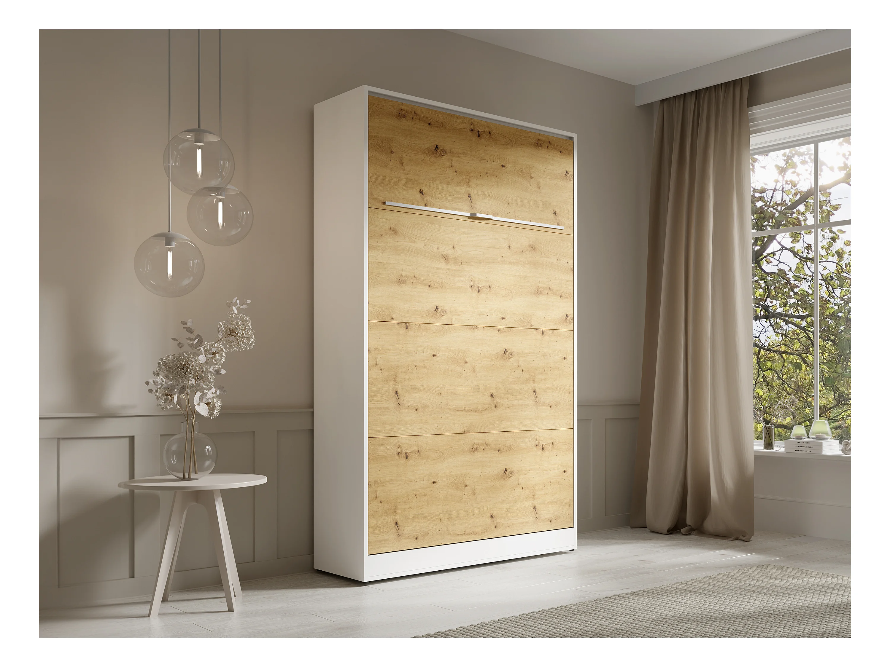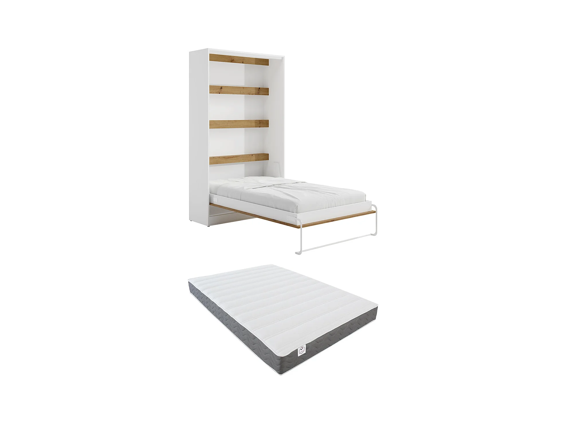 Sengeskapselseng 120 x 200 cm - Manuell vertikal åpning - Med LED-lys - Hvit og naturlig + Madrass - RAPILI