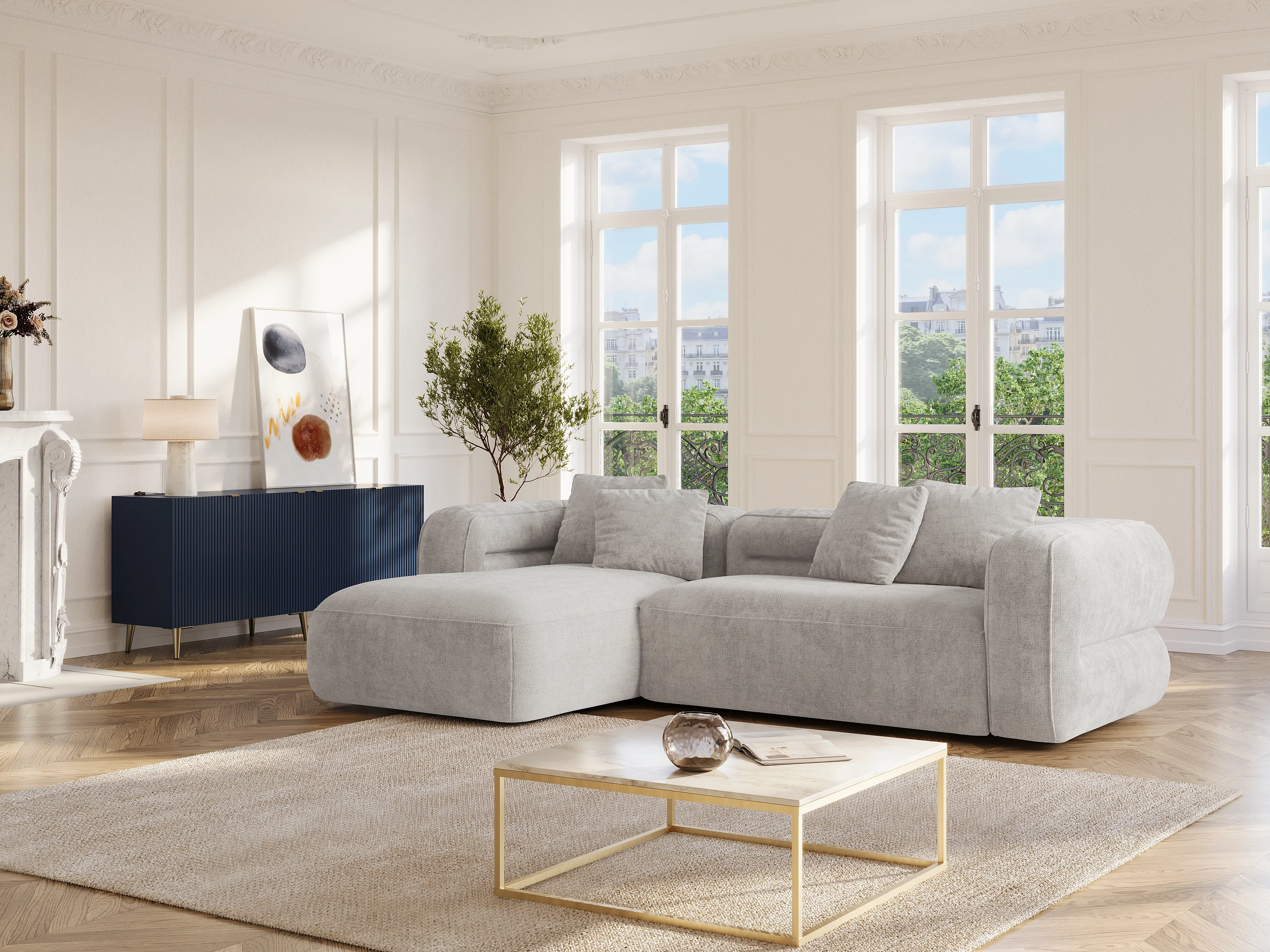 Venstre hjørnesofa i lysegrå teksturert stoff TREVALIS